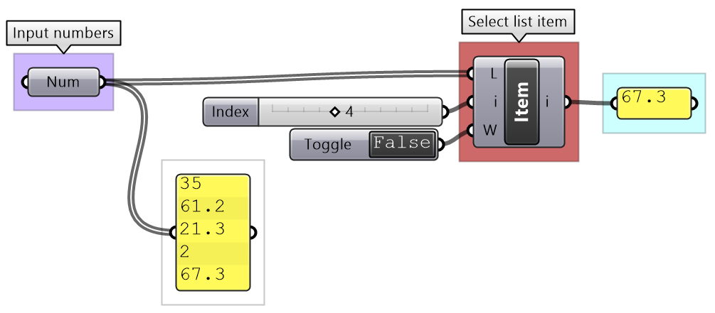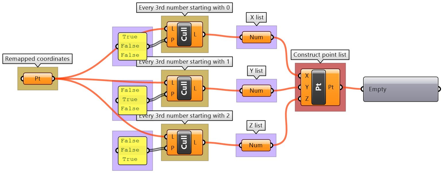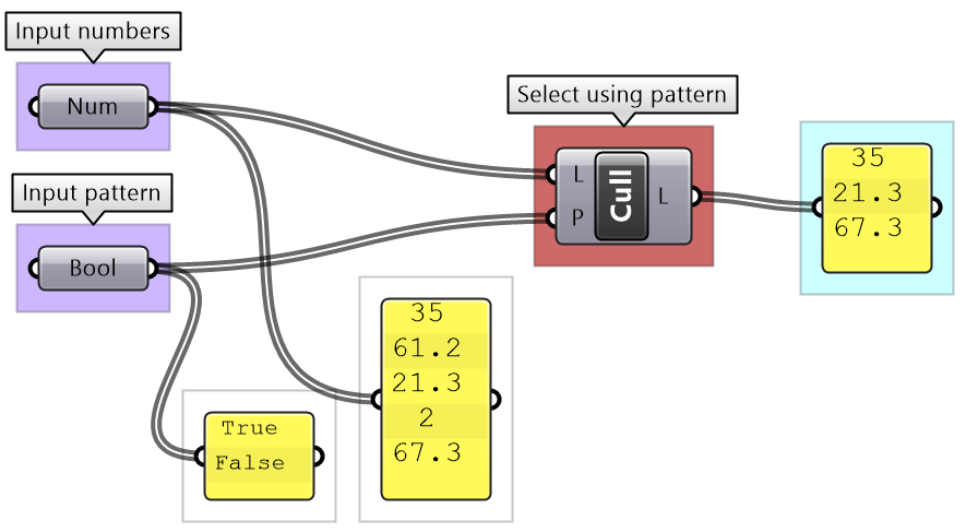 As you can see from the examples, selecting specific items or using cull components yield a subset of the data, and the rest is thrown away. Many times you only need to isolate a subset to operate on, then recombine back with the original set. This is possible in GH, but involves more advanced operations. We will get into the details of these operations when we talk about advanced data structures in chapter 3.
