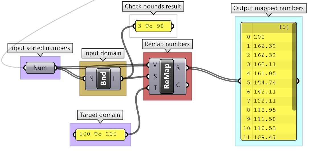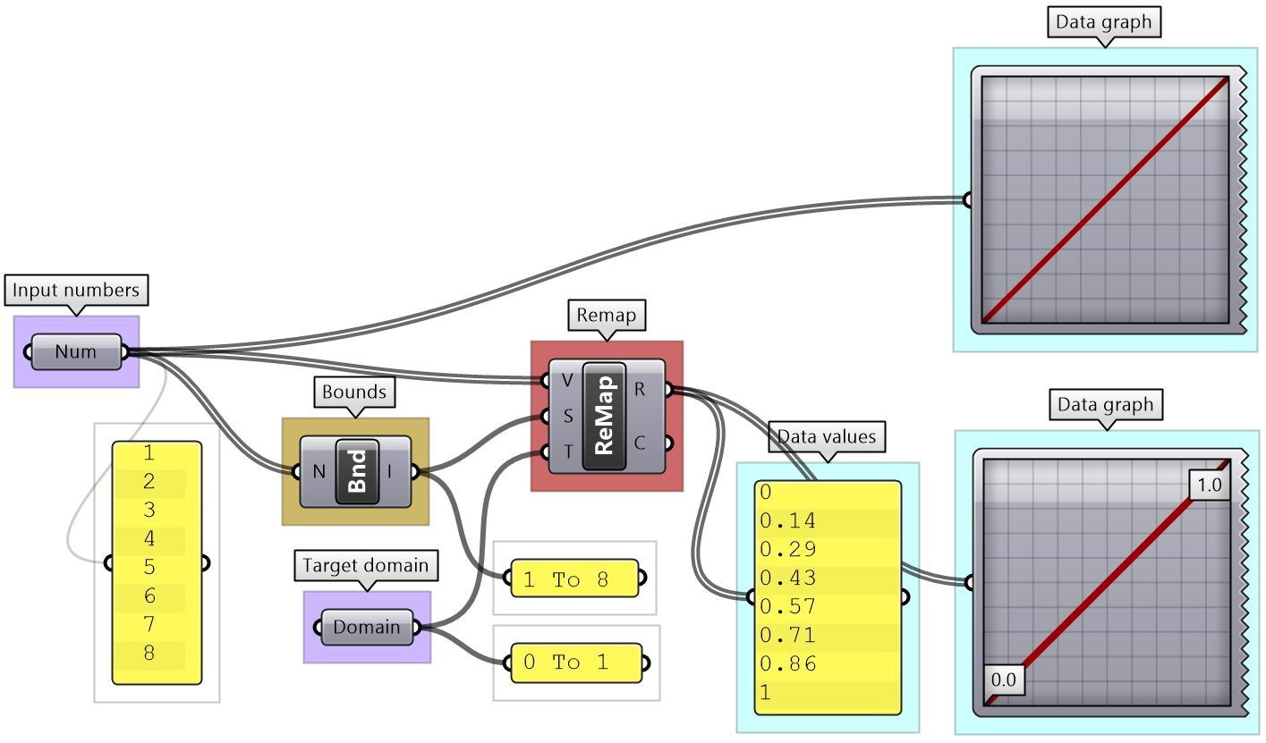 That refers to the linear mapping of a range of numbers where each number in a set is mapped to exactly one value in the new set. GH has a component to perform linear mapping called ReMap. You can use it to scale a set of numbers from its original range to a new one. This is useful to scale your range to a domain that suits your algorithm’s needs and limitations.