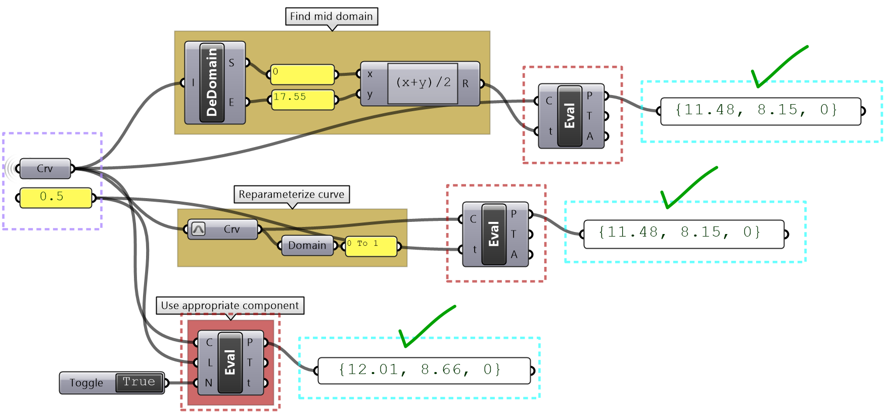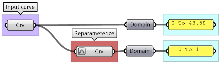 As you know, parametric curves have “domains” (the range of parameters that evaluate to points on the curve). For example, if the domain of a given curve is between 12.5 to 51.3, evaluating the curve at 12.5 gives the point at the start of the curve. Many times you need to evaluate multiple curves using consistent parameters. Reparameterizing the domain of curves to some unified range helps solve this problem. One common domain to use is “0 To 1”. At the input of each curve in any GH component, there is the option to Reparameterize which resets the domain of the curve to be “0 to 1”.