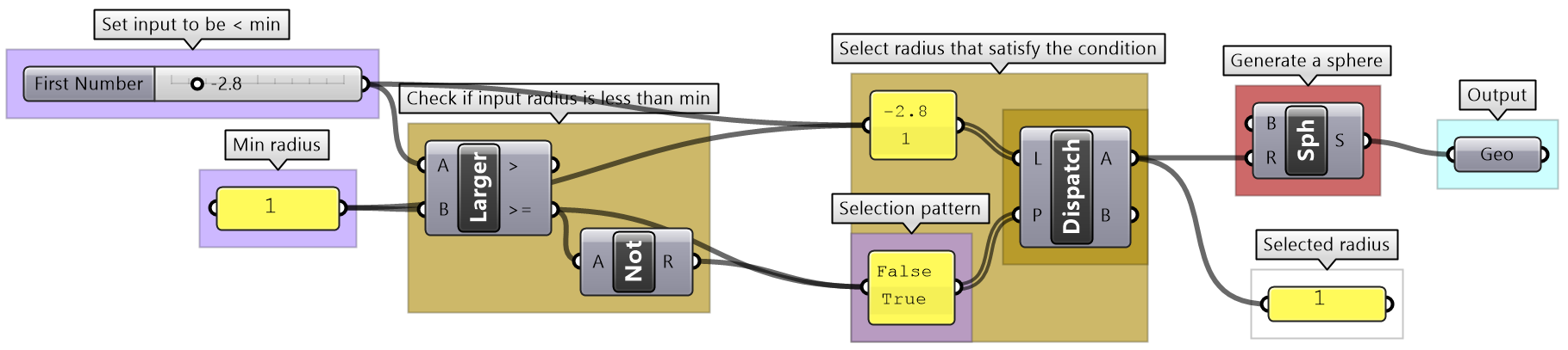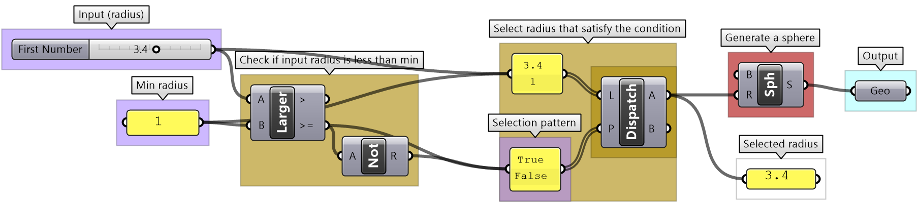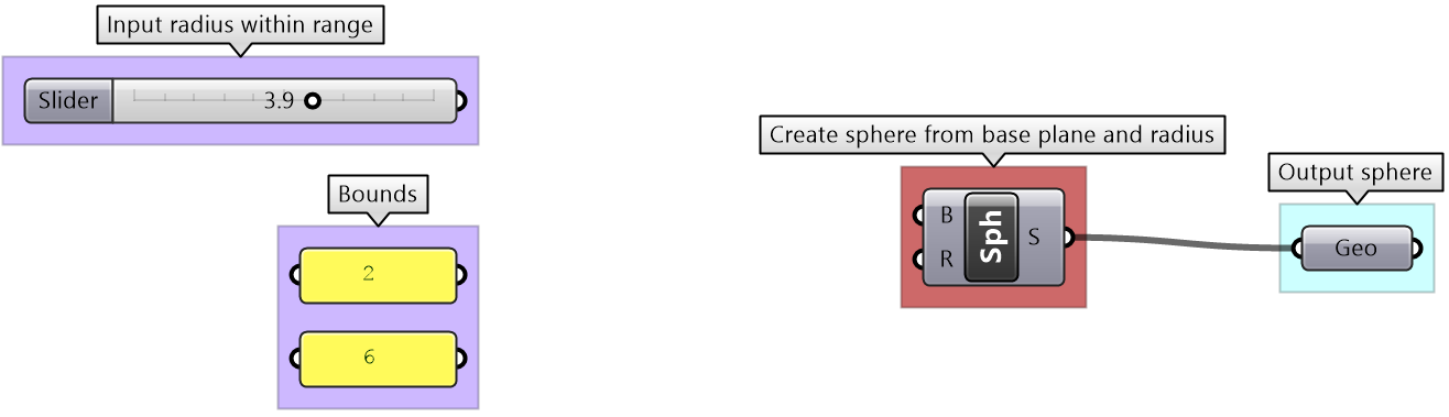| Use the 4-step process to draw a sphere with a radius between 2 and 6. If input is less than 2, then set the radius to 2, and if input radius is greater than 6, set the radius to 6. Use a number slider to input the radius and set between 0 and 10 to test. Make sure your solution is well organized, color-coded and labeled properly. | ||||||||||