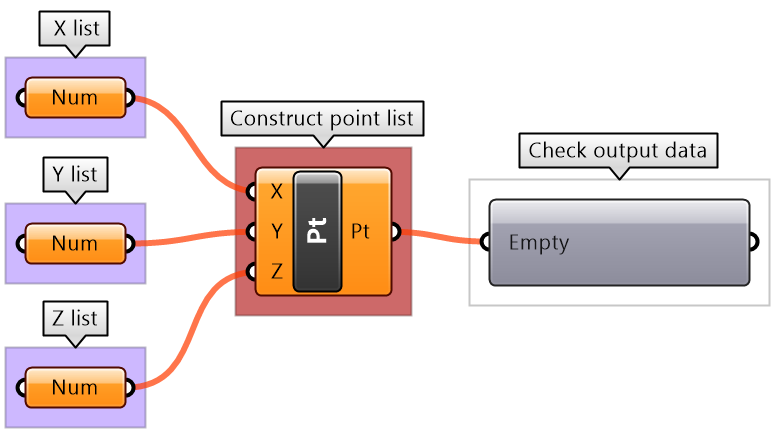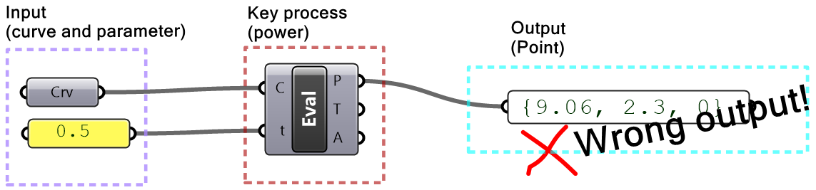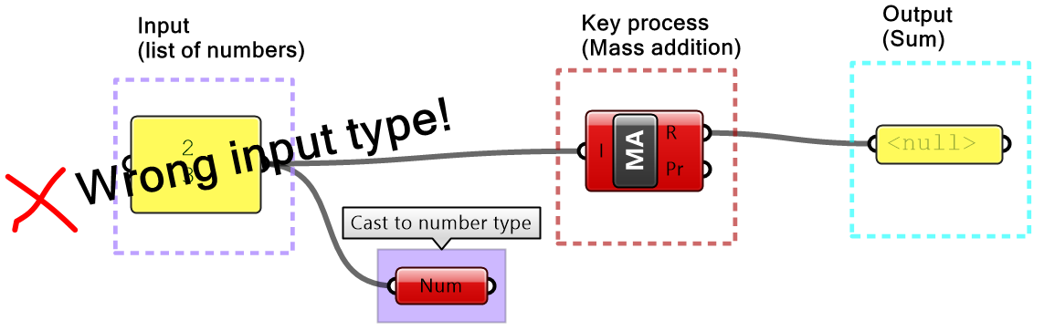 It is worth noting that sometimes GH components simply ignore invalid input (null or wrong type). In such cases, you are likely to end up with an unexpected result and it will be hard to find the bug. It is very important to verify the output from each component before using it.