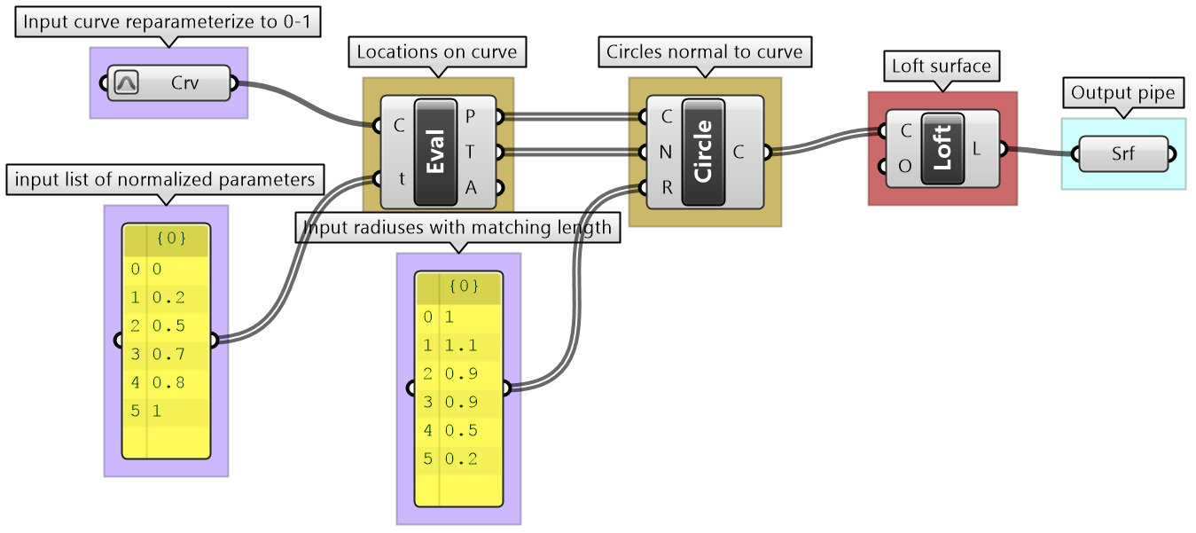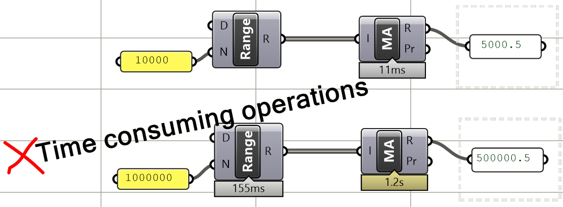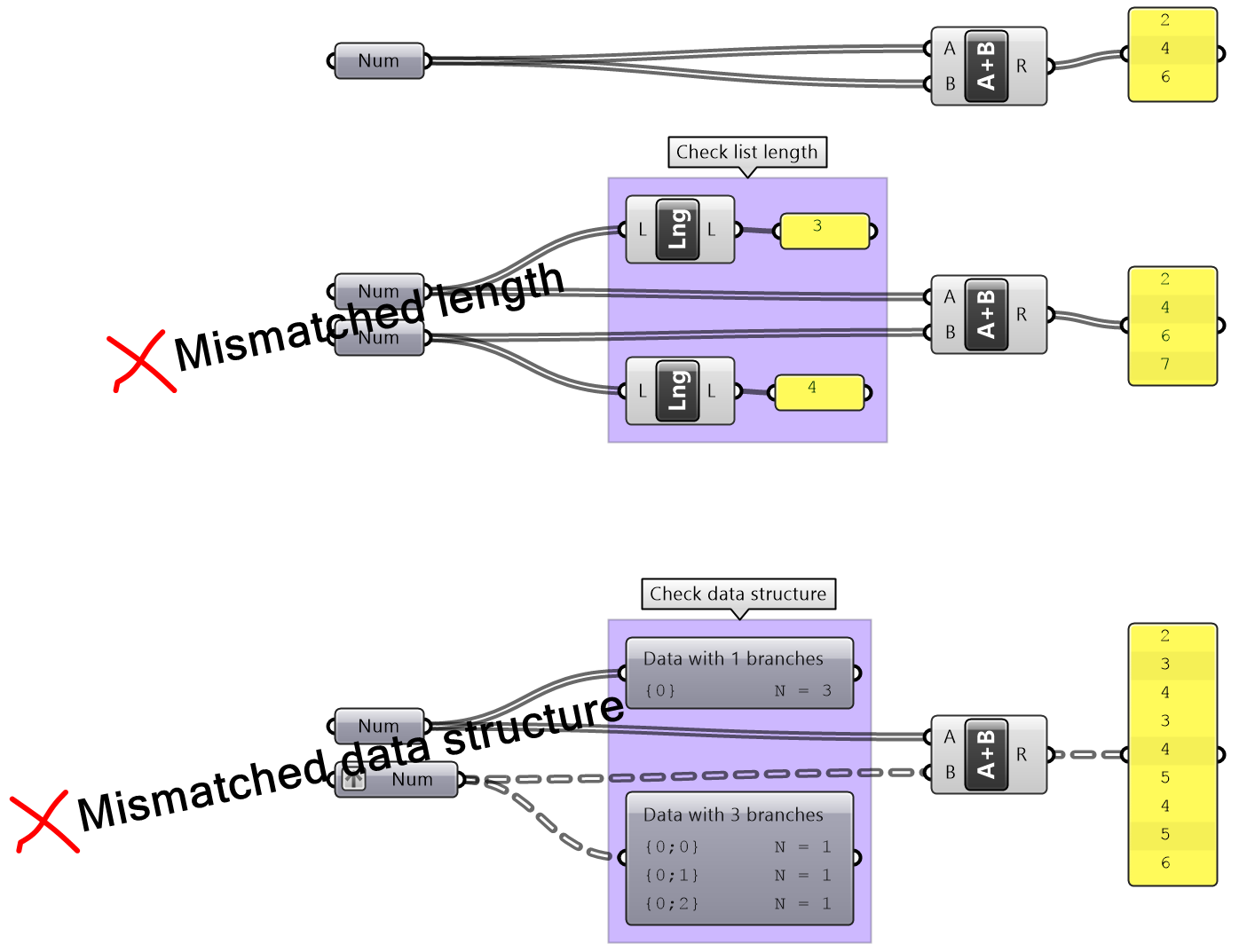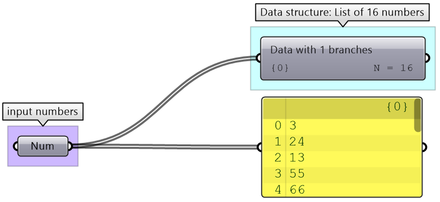 The issue of mismatched data structures as input to the same process or component is particularly tricky to guard against in GH, and has the potential to spiral the solution out of memory. It is essential to test the data structure of all input (except trivial ones) before feeding into any component. It is also important to examine desired matching under different scenarios (data matching will be explained at length later).