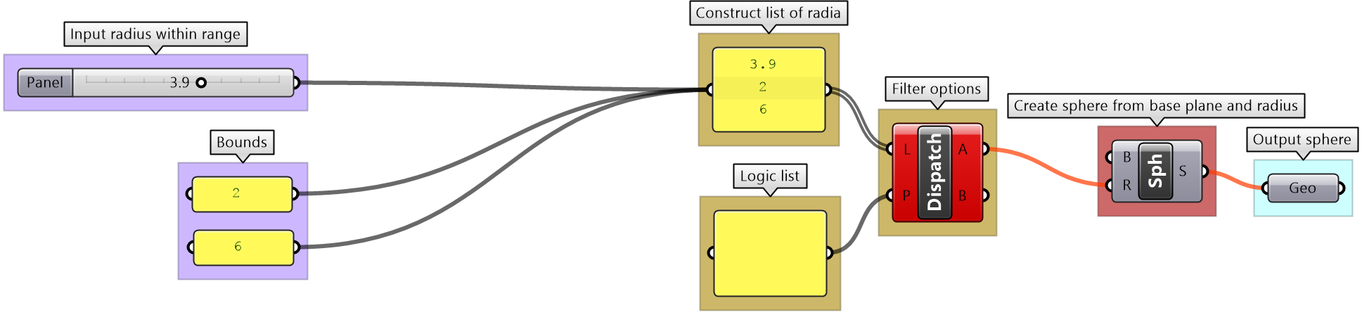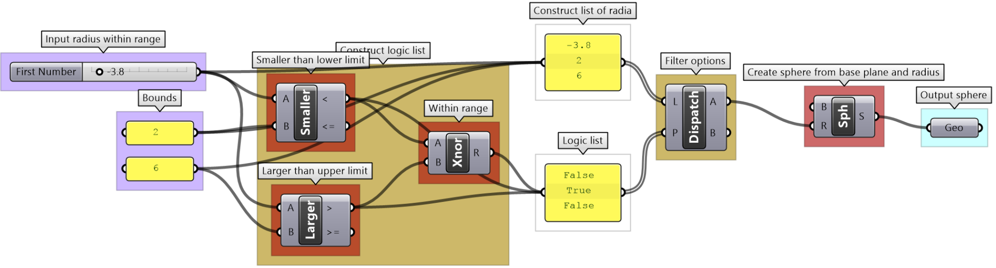 Logical operations are used to create conditional flow of data. For example, if you like to draw a sphere only when the radius is between two values, then you need to create a logic that blocks the radius when it is not within your limits.